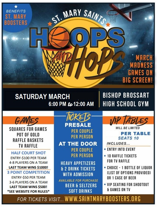 Hoops for Hops, our March Madness-themed fundraiser! Enjoy watching basketball games on TV while indulging in delicious food and drinks. It’s a great opportunity to meet with friends and cheer on participants competing in the half-court shot and 3-point competition. The event also features a silent auction and raffle, adding even more excitement to the evening. Don’t miss out on the fun—all proceeds support our athletic programs at Saint Mary School!