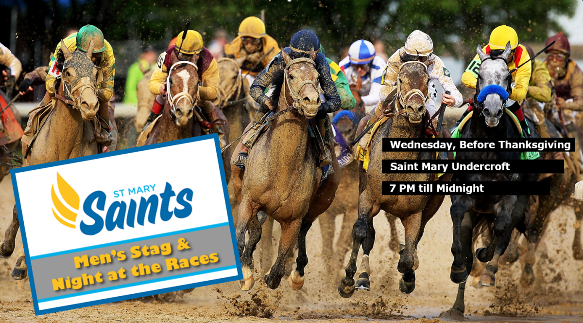 Join us for "A Night at the Races," the annual men's stag held in the undercroft at Saint Mary School on the Wednesday before Thanksgiving. Enjoy an evening of camaraderie with food, drinks, and exciting activities including raffles, video horse races, and a split the pot drawing. This event is a fantastic opportunity to connect with your community while supporting youth athletics at Saint Mary. All proceeds go towards funding kids' athletics.